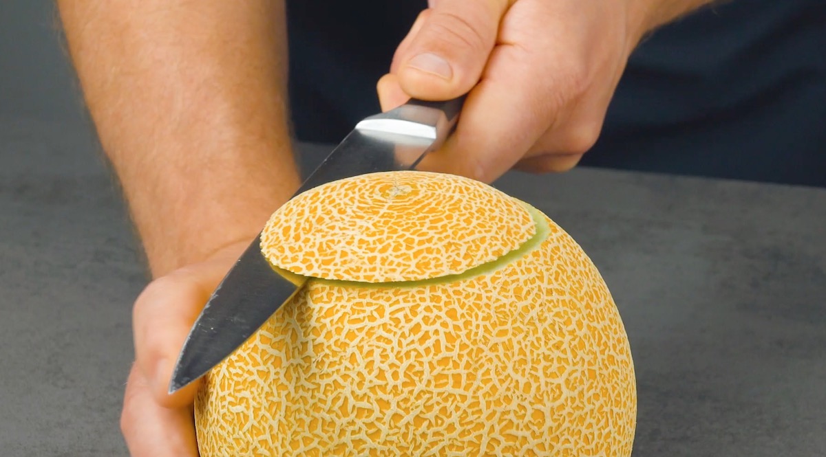 2. Schneide oben die Schale der Melone ab, sodass du einen abnehmbaren Deckel erhältst.