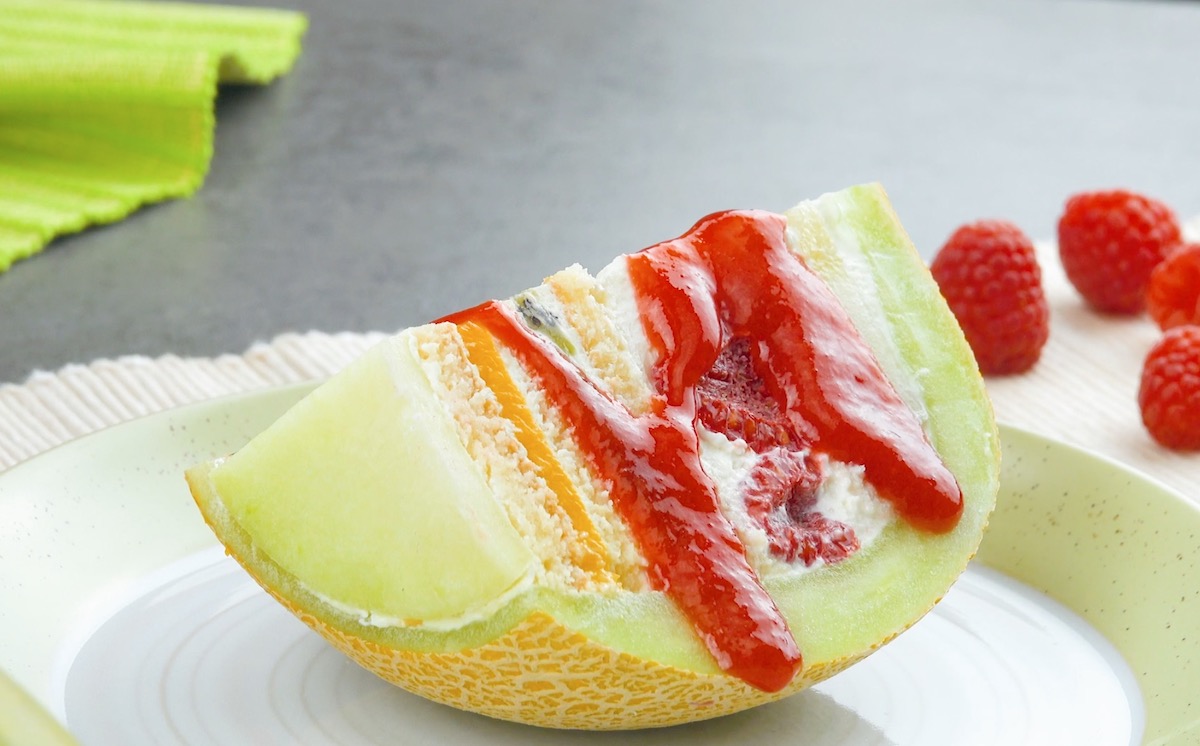 Dieses köstliche Obst lässt sich übrigens nicht nur in Stücke geschnitten oder direkt aus der Schale verspeisen, sondern schmeckt auch in diversen Variationen. Wir präsentieren dir heute ein Rezept, in dem eine handelsübliche Netzmelone mit Biskuit, Creme und diversen Früchten gefüllt wird:
