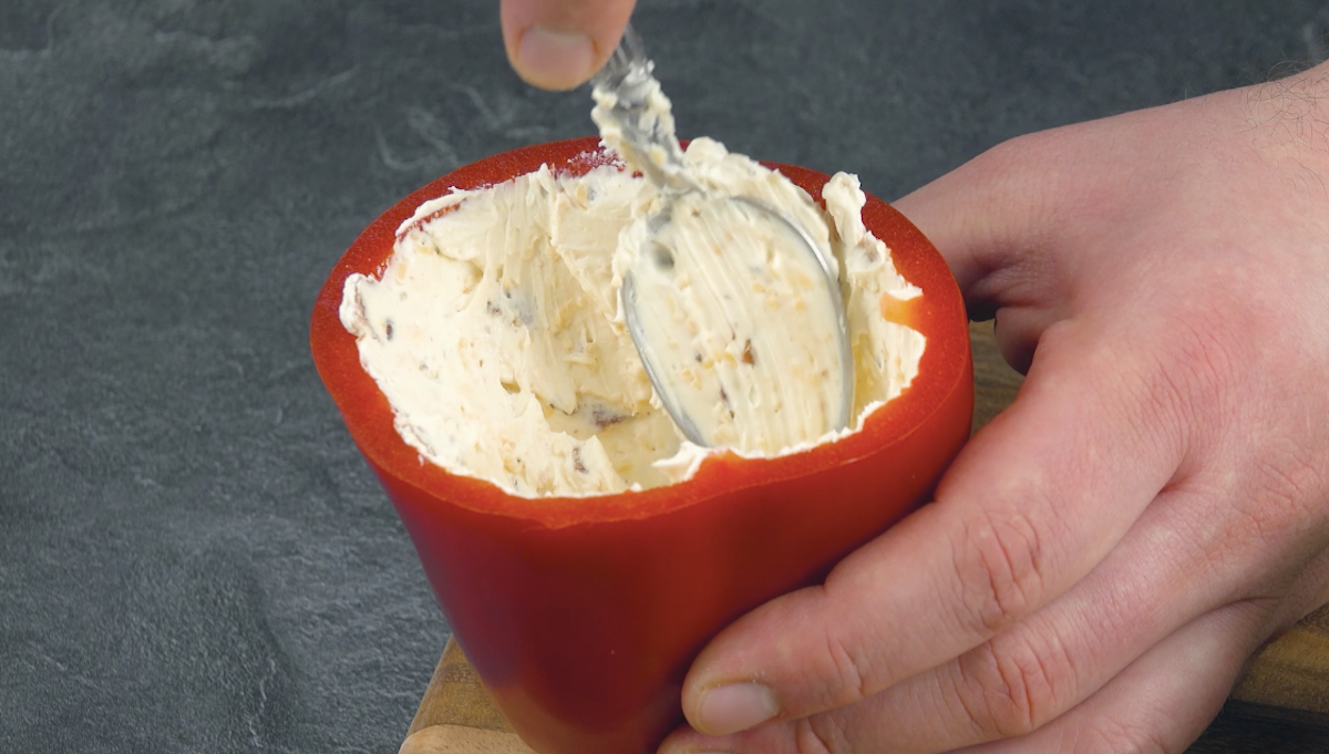 4. Fülle etwa 3 EL der Frischkäsemasse in die rote Paprika.