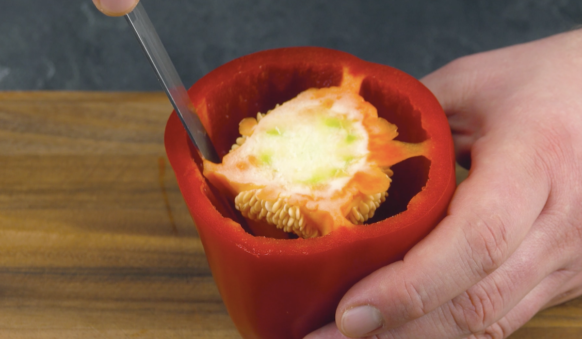 3. Wasche die rote Paprika, schneide den Deckel ab und entferne das Kerngehäuse.