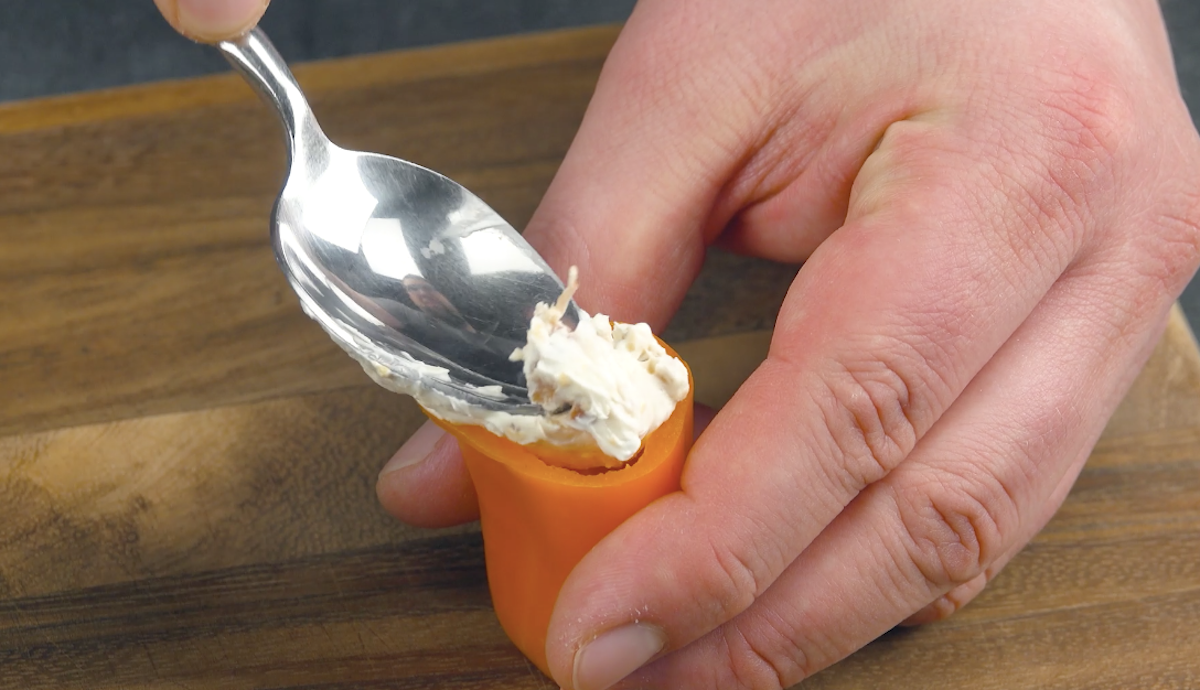 5. Schneide von der Snackpaprika den Deckel ab und entferne das Kerngehäuse. Fülle 1 TL der Frischkäsemasse hinein.