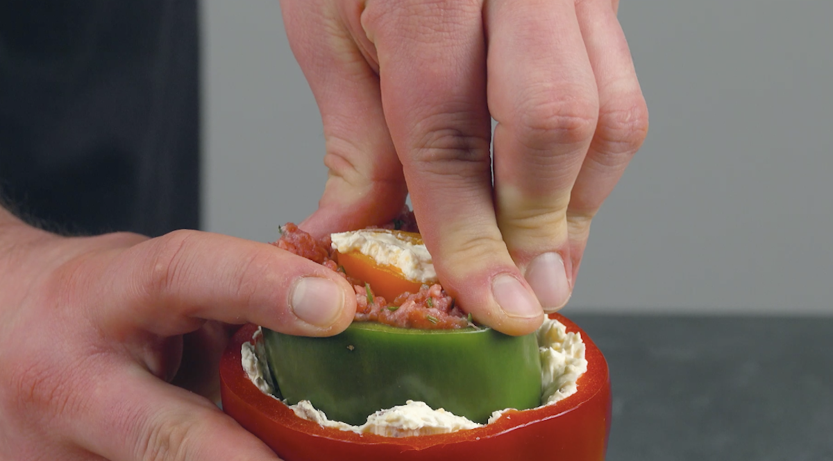 7. Nun steckst du alles ineinander. Die Snackpaprika kommt in die grüne Paprika und die grüne Paprika kommt in die rote Paprika.