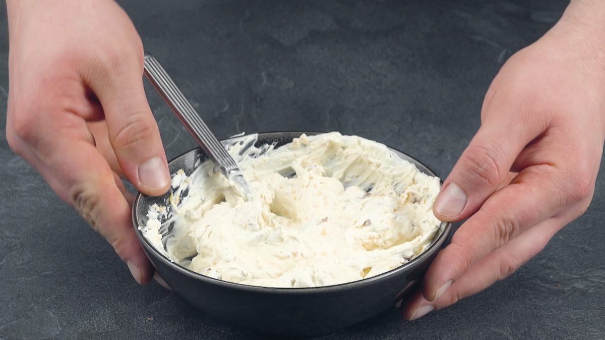 1. Als Erstes werden beide Füllungen hergestellt. Gib Frischkäse und geriebenen Cheddar in eine Schüssel. Brate in einer Pfanne den Bacon knusprig an und lasse ihn danach kurz abkühlen. Schneide ihn grob klein und gib ihn zu dem Frischkäse. Würze mit Pfeffer und verrühre alles miteinander.