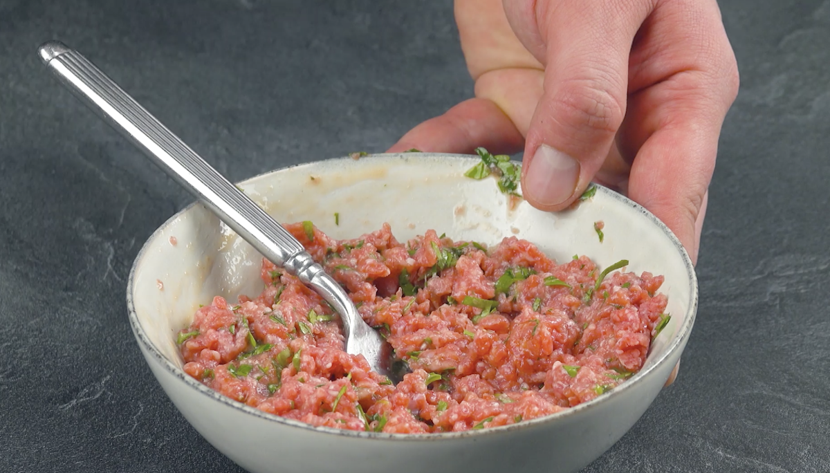 2. Für die Hackfleischfüllung gibst du Hackfleisch, Ei, kleingehackte Petersilie, Salz und Pfeffer in eine Schüssel und vermengst alles miteinander.