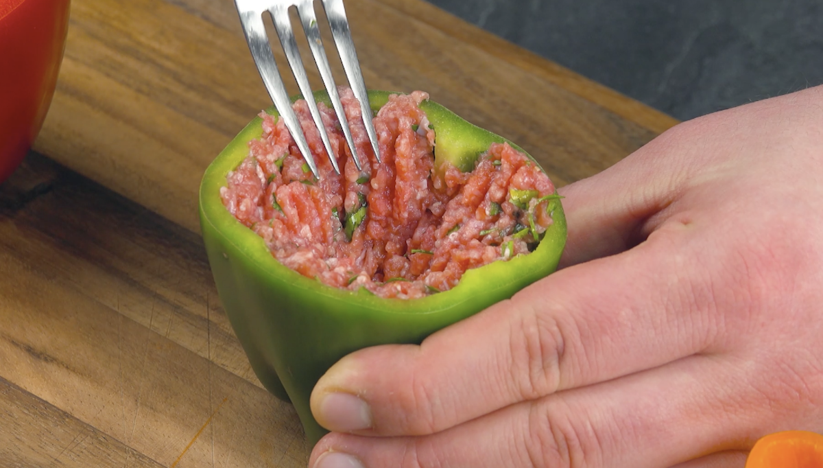 6. Schneide von der grünen Paprika den Deckel ab, entferne das Kerngehäuse und fülle Hackfleisch hinein.
