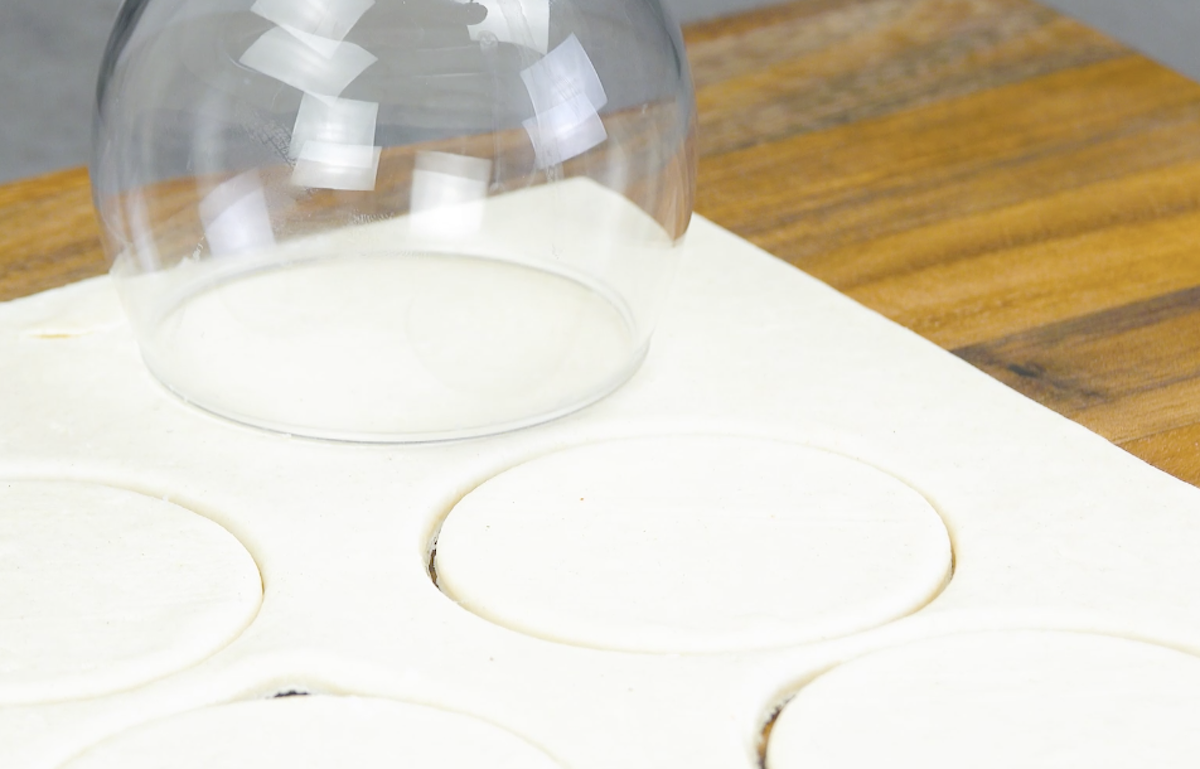 3. Rolle den Blätterteig aus und stich mit einem runden Ausstecher oder einem Glas kleine Kreise aus.