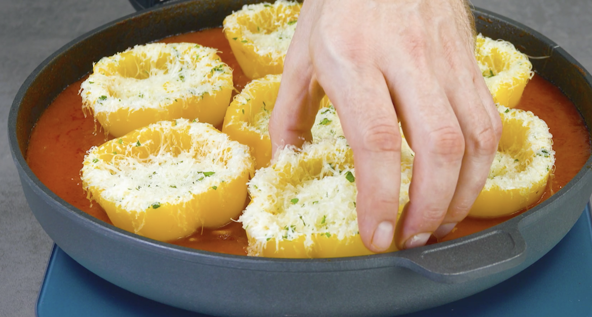 2. Halbiere die Paprika und schneide die Oberteile in kleine Stücke. Gib die Stückchen, klein gehackte Petersilie und geriebenen Käse in die unteren Hälften und lege diese alle zur Tomatensoße in die Pfanne.