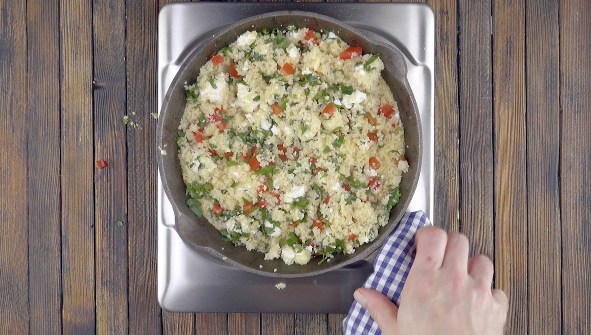 2.1) Erhitze für die Paprikas mit der Couscousfüllung zunächst die Gemüsebrühe und den Couscous, zugedeckt in einer Pfanne, so lange, bis der Couscous aufgequollen ist.