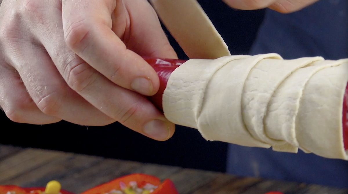 1.6) Wickle um jede Paprika ein bis zwei Blätterteigstreifen.