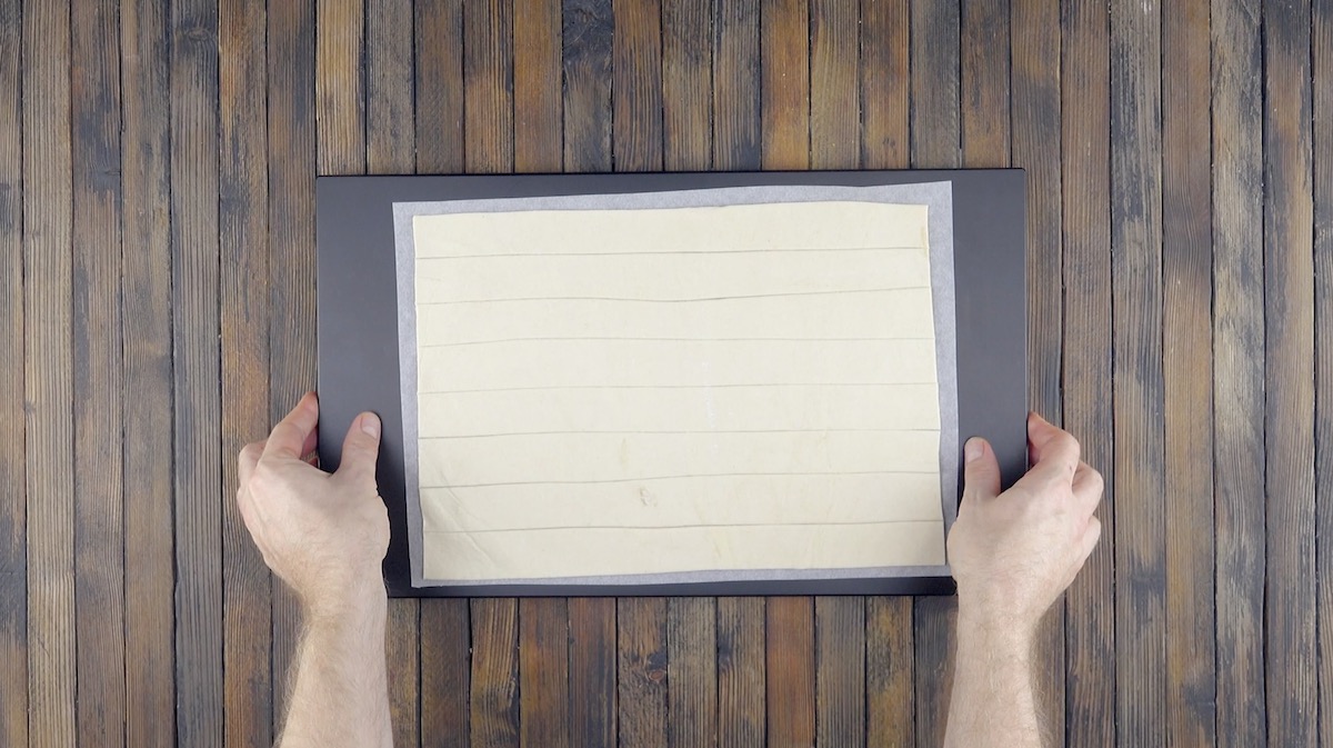 1.3) Nimm einen Pizzaroller und schneide den ersten Blätterteig der Länge nach in etwa acht Streifen.