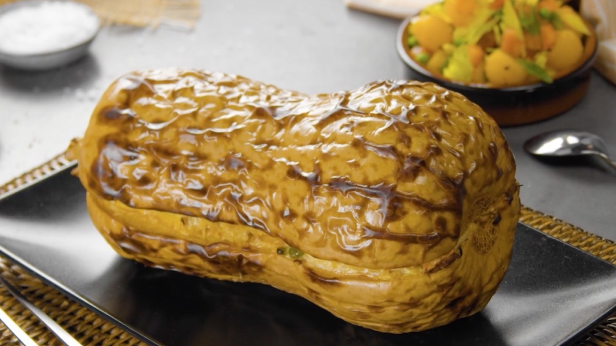 7. Klappe die Kürbishälften zusammen und achte dabei darauf, dass die Hackrolle gut von der Toastmischung umschlossen wird. Lege den gefüllten Butternusskürbis dann auf ein umgedrehtes Muffinblech und backe ihn für 60 Minuten bei 200 °C Umluft.