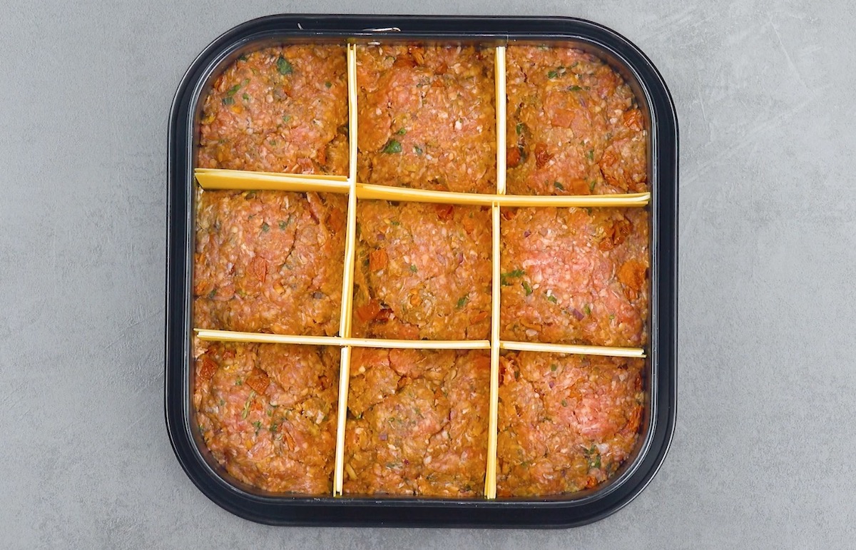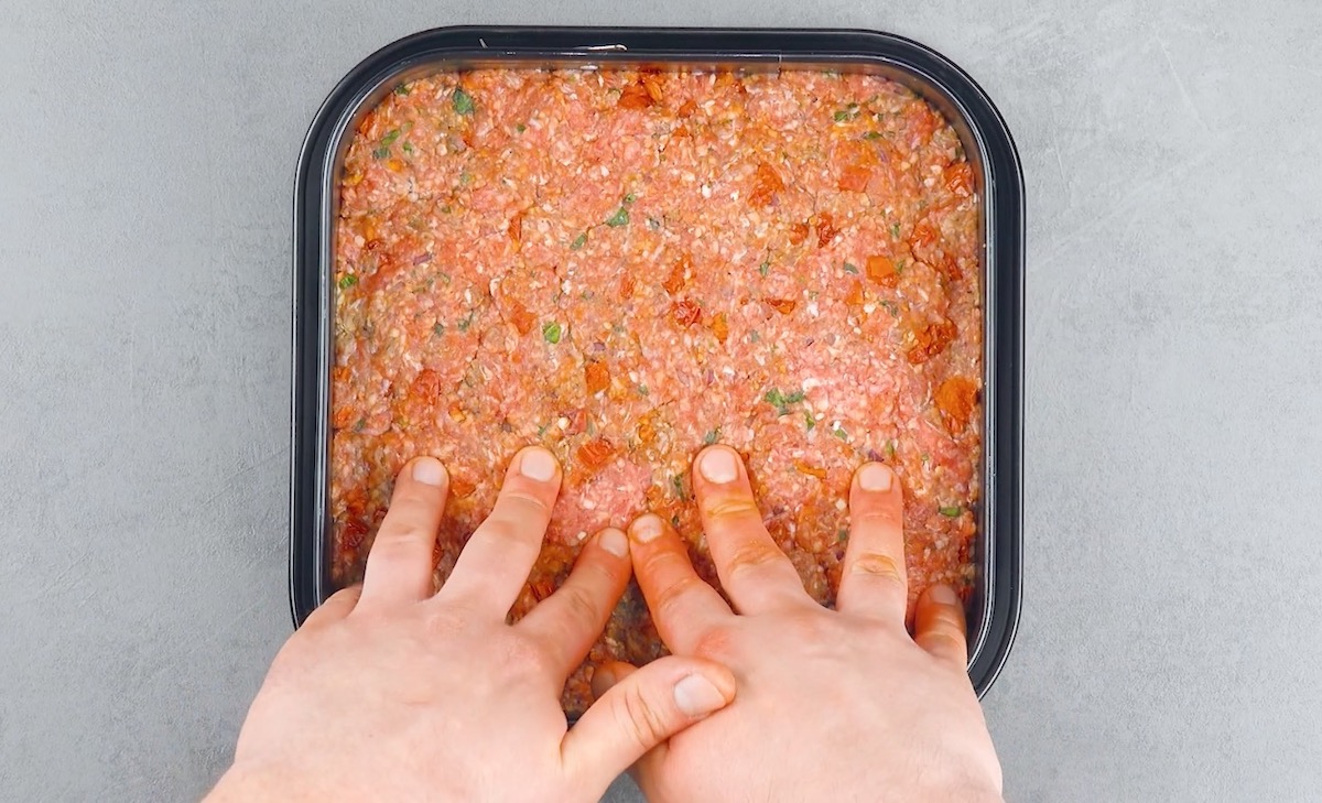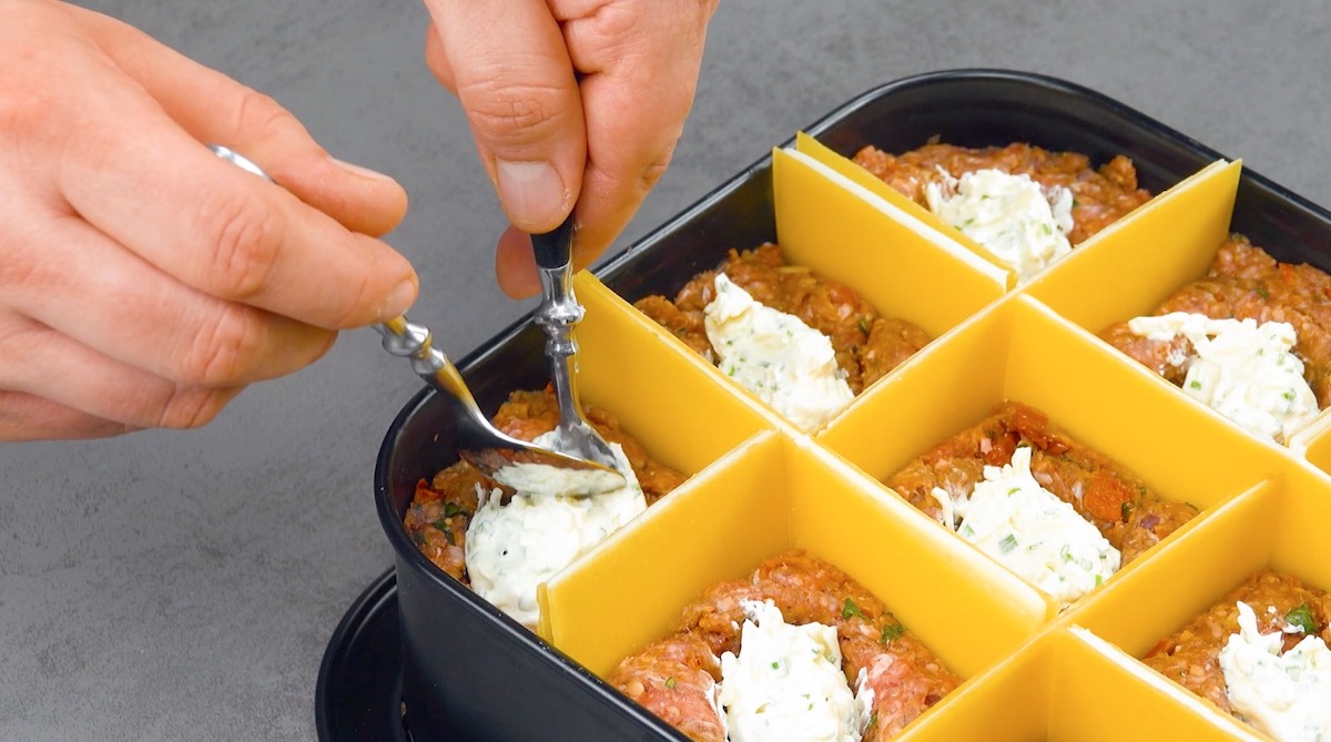 2. Lege Ziegenkäse und Lasagneplatten zu Sandwiches zusammen und schiebe sie, wie im Video gezeigt, in das Hackfleisch, sodass neun gleich große Felder entstehen.