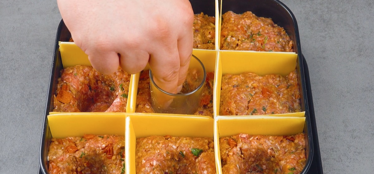 3. Drücke mit dem Boden eines Schnapsglases eine Mulde in jedes Hackfleischfeld.