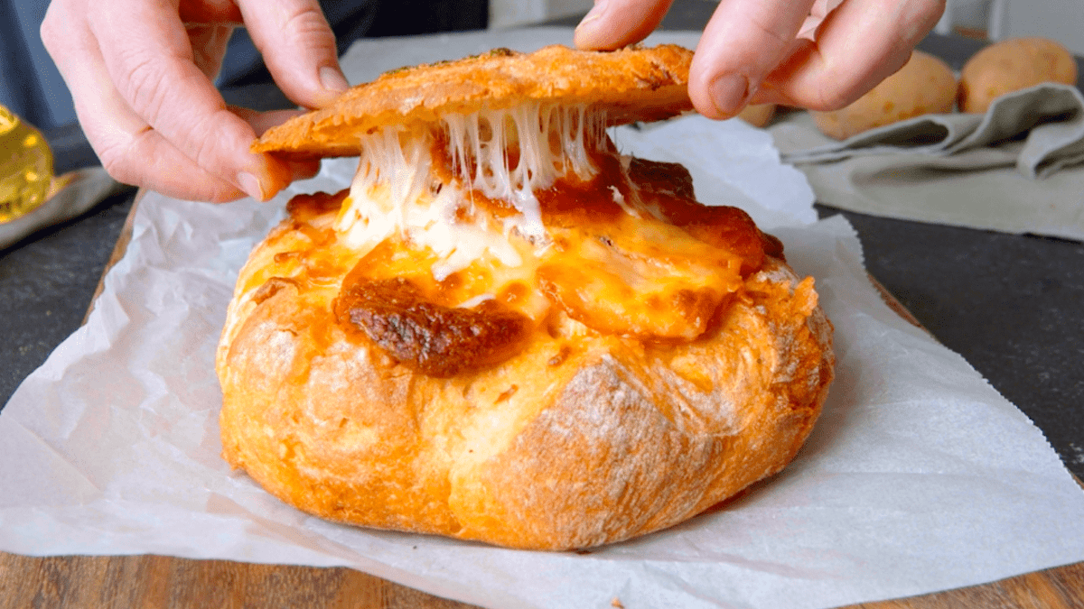 Leckeres Weißbrot kann viel mehr sein als nur ein langweiliger Bestandteil von Sandwiches oder French Toasts. Heute zeigen wir dir, wie man Hähnchen mit Kartoffeln und Spinat in Verbindung mit Weißbrot zubereiten kann. Und zwar als Füllung in einem ganzen Laib Brot. Mit ordentlich Käse, Tomaten und einer Royale wird dieses Gericht zu einem supersaftigen und sättigenden Genuss.
