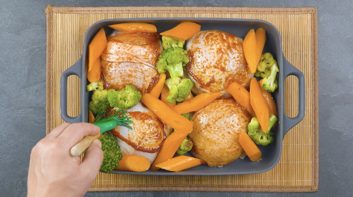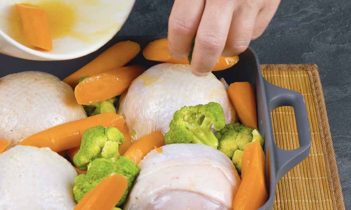 5. Vermenge den Brokkoli und die Karotten in einer Schüssel mit Olivenöl, Salz und Pfeffer und verteile alles in der Auflaufform zwischen den Hähnchenfleisch-Halbkugeln.