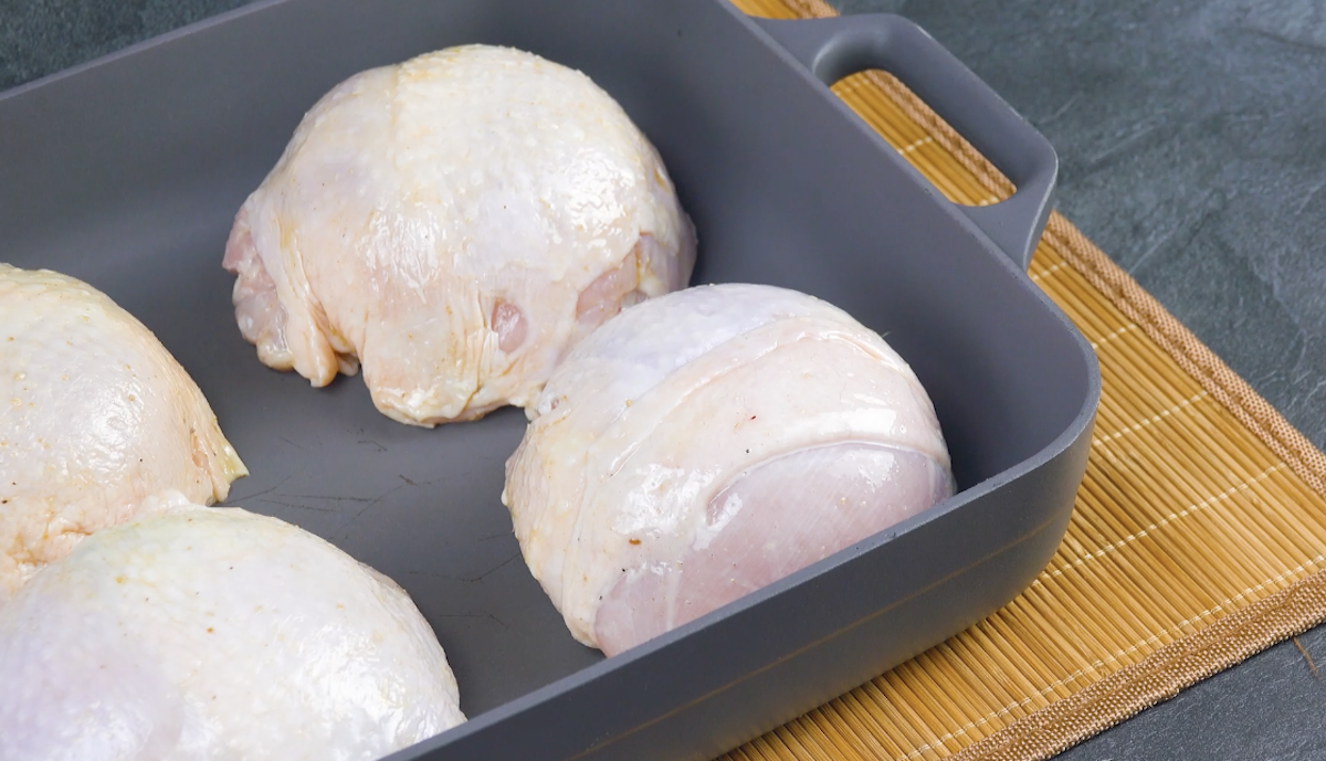 1. Löse die Hähnchenschenkel vorsichtig vom Knochen, sodass die Haut unversehrt bleibt. Verrühre Milch, Öl, Kreuzkümmel, Knoblauch, Salz und Pfeffer in einer Schüssel miteinander und mariniere das Fleisch darin: Stelle es, abgedeckt mit Frischhaltefolie, für mindestens 2 bis 3 Stunden, am besten aber über Nacht, in den Kühlschrank.