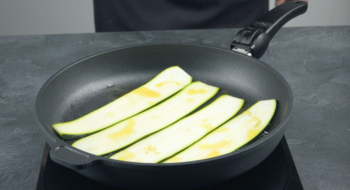 1. Schneide die Zucchini längs in ca. 0,5 cm dünne Streifen, salze sie und dünste sie ca. 2 Minuten von jeder Seite in etwas Öl und Wasser. Nimm die Zucchini aus der Pfanne und lasse sie abtropfen und abkühlen.