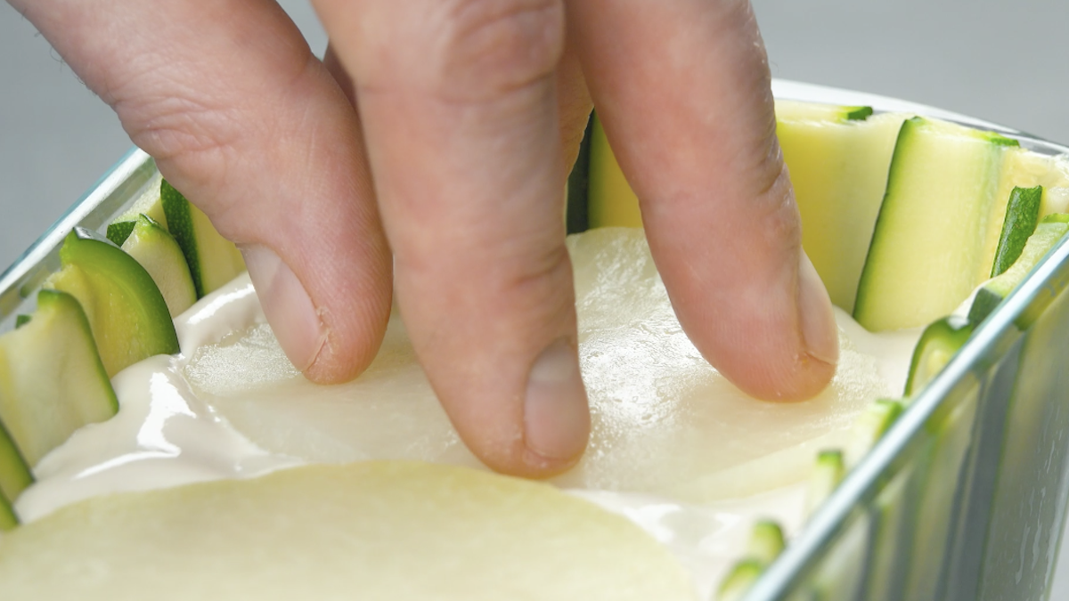 6. Gib eine weitere Kelle der Creme in die Form und lege die Kohlrabi-Scheiben obendrauf.