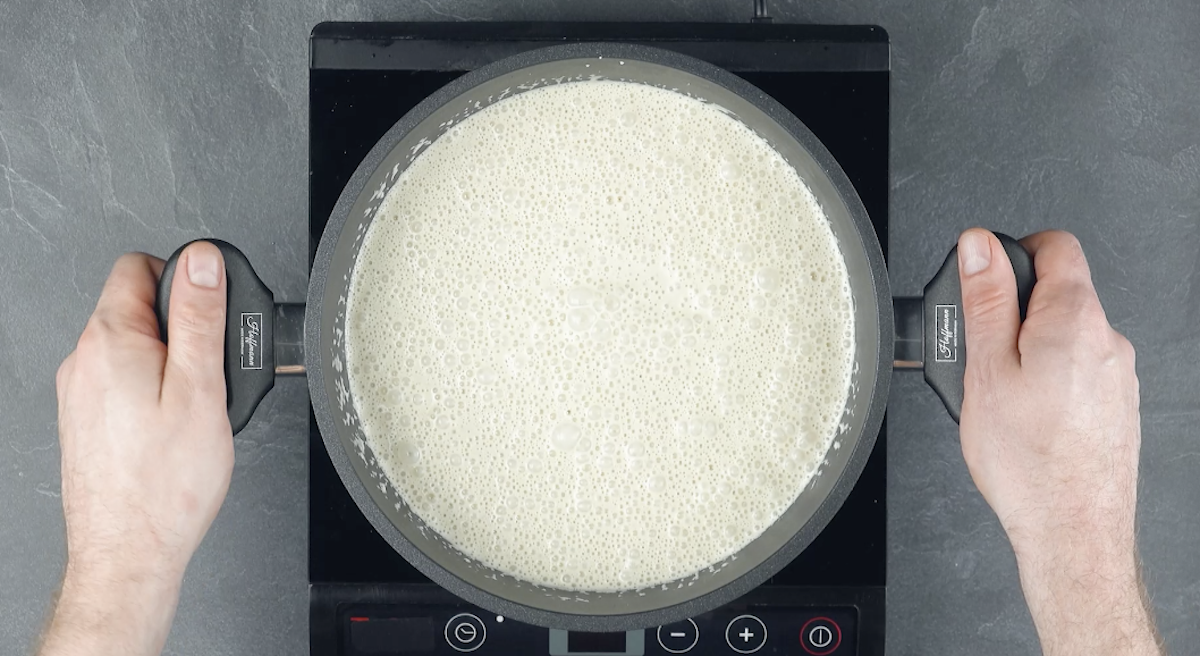 2. Bringe Butter in einem Topf zum Schmelzen. Gib klein geschnittene Zwiebeln und Champignons hinzu und warte, bis die Zwiebeln glasig sind. Lösche dann mit Weißwein ab und lasse alles einreduzieren. Gieße dann Sahne dazu und lasse alles etwa 10 Minuten leicht köcheln. Würze noch mit Muskatnuss, Salz und Pfeffer. Lasse die Mischung abkühlen, bis sie lauwarm ist. Drücke die Gelatine aus, füge sie und den Frischkäse hinzu und mixe alles mit einem Stabmixer, sodass eine feine Creme entsteht. Bevor du die Creme weiterverwendest, lasse sie bei Raumtemperatur etwas anziehen.