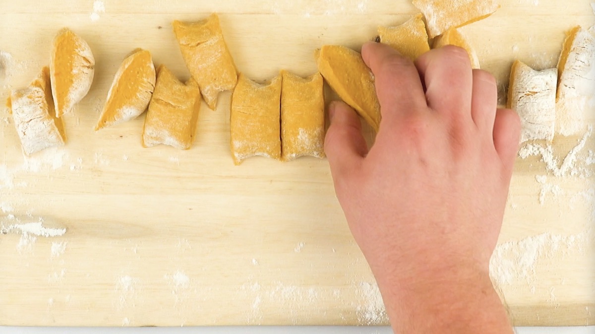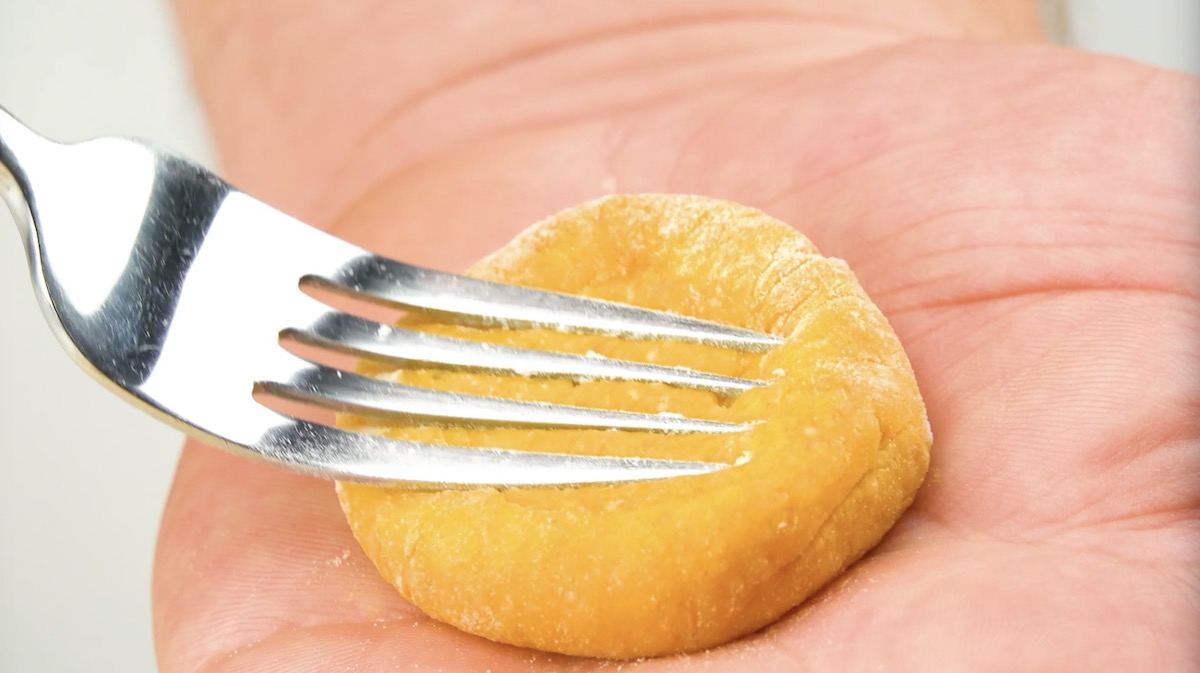 4.) Forme alle Stücke einzeln zu Kugeln und drücke sie mit einer Gabel zu Gnocchi.