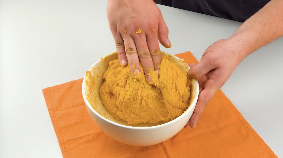 2.) Lass die Kürbisstücke und die Kartoffeln kurz abkühlen. Schäle dann die Kartoffeln. Schabe mit einem Löffel die Kürbisviertel aus und gib das Fruchtfleisch in eine Schüssel. Füge die Kartoffeln hinzu und zerstampfe das Ganze mit Mehl, Semmelbrösel, Parmesan und dem Eigelb zu einer homogenen Masse. Schmecke die Mischung dann mit Muskat, Salz und Pfeffer ab. Tipp: Sollte dir die Masse nicht cremig genug erscheinen, kannst du einfach etwas Olivenöl hineinmischen.