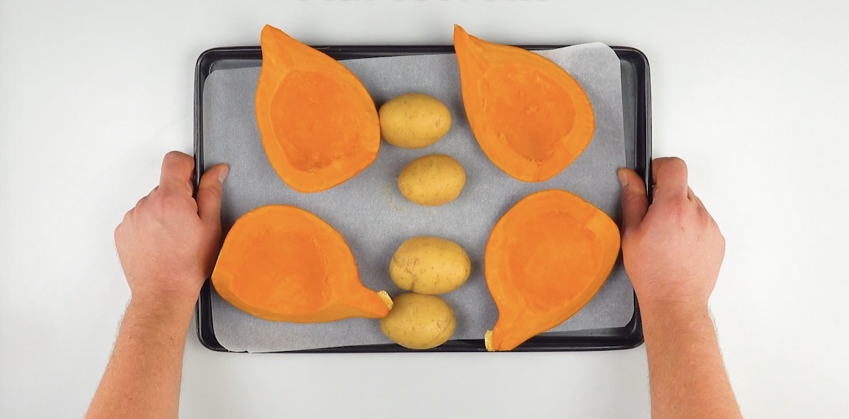 So geht es: 1.) Viertele den Kürbis und schneide die Kerne weg. Gare die Viertel dann zusammen mit den Kartoffeln für 60 Minuten bei 160 °C Umluft.