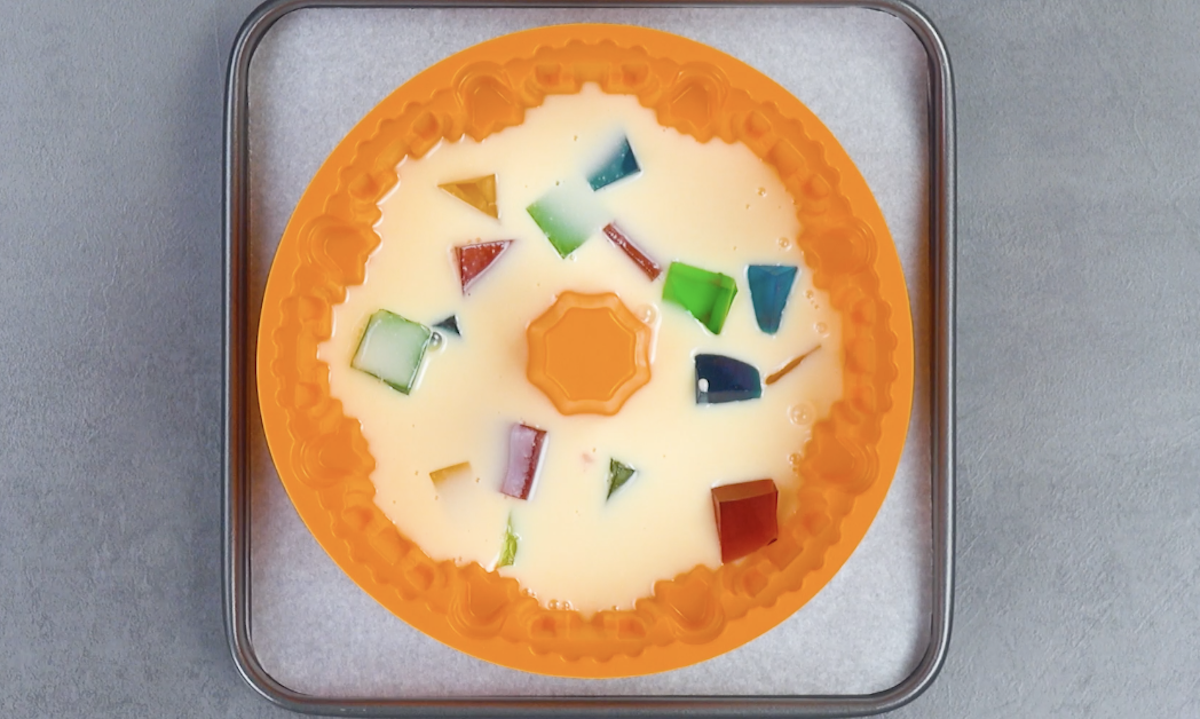 5. Sprühe die Silikonform dünn mit Trennspray aus. Lege dann ca. die Hälfte der Götterspeisen-Stücke wild durcheinander in die Form (ungefähr bis auf halbe Höhe der Form). Gieße dann die abgekühlte Ananascreme in die Form (aber nur so weit, bis die Götterspeise-Stücke bedeckt sind). Lass alles kurz im Kühlschrank anziehen.