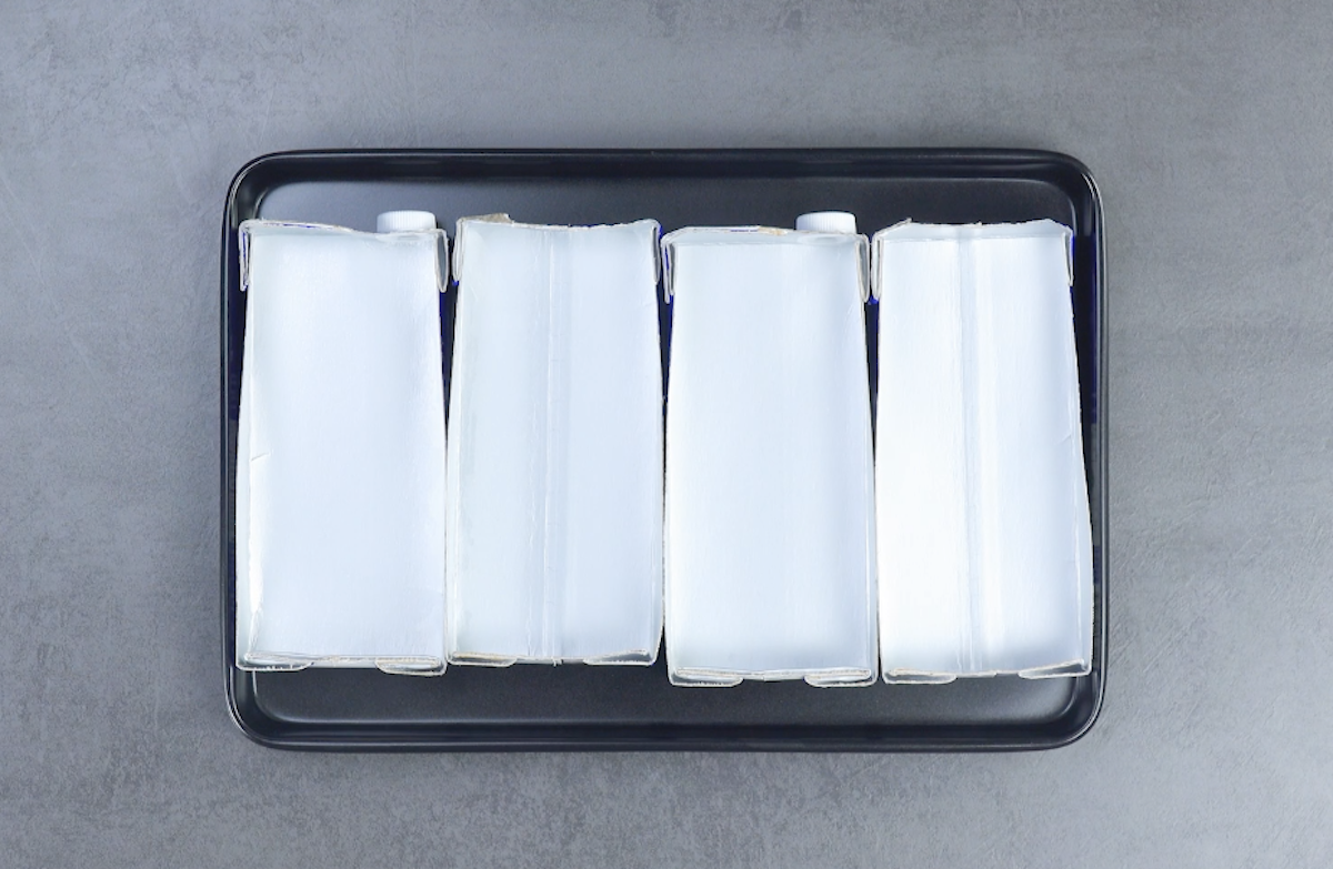 1. Schneide die leeren Milchkartons mit einem Messer der Länge nach mittig auf. Du brauchst 4 gleich große Formen. Spüle die Formen gut aus, trockne sie ab und lege sie nebeneinander auf ein Backblech.
