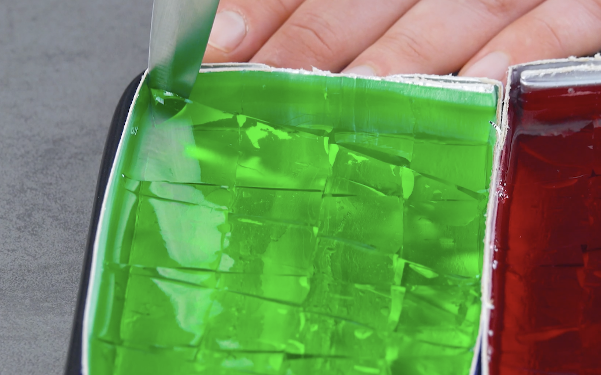 4. Nachdem die vier Sorten Götterspeise gekühlt sind, holst du sie aus dem Kühlschrank. Schneide alle 4 Sorten mit einem Messer in unterschiedlich große Stücke.