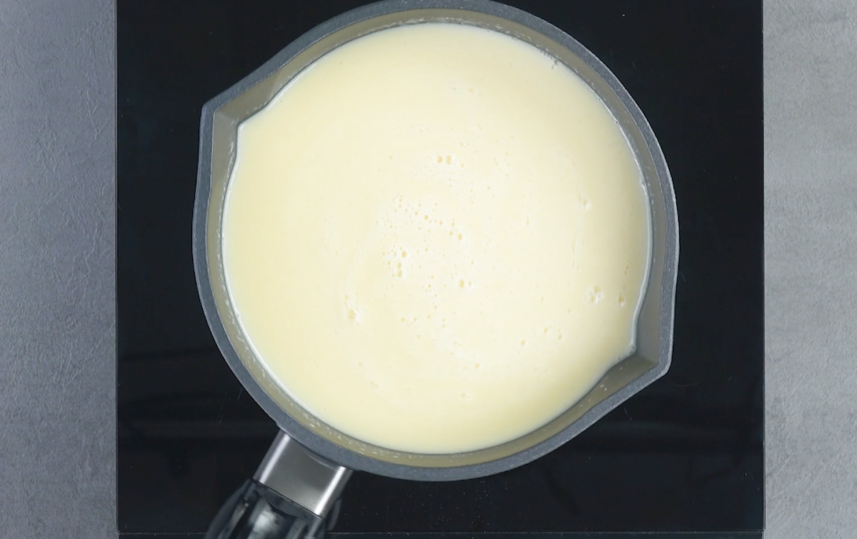 3. Verrühre Wasser und Gelatinepulver und lasse es kurz quellen. Gib dann Sahne, süße Kondensmilch und Ananassaft in einen Topf und erwärme alles langsam. Dann kommt die gequollene Gelatine hinzu. Erwärme die Mischung so lange, bis sich die Gelatine komplett aufgelöst hat. Nimm den Topf vom Herd und lass die Masse auf ca. 30 °C abkühlen (wichtig!).