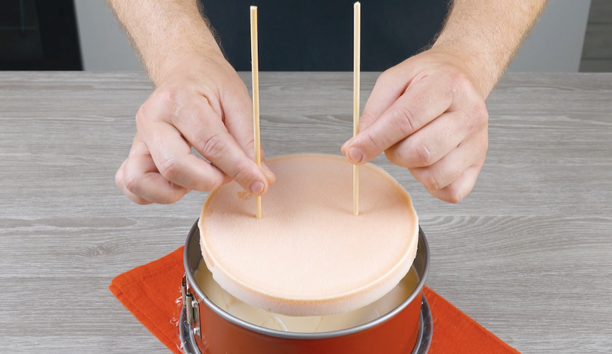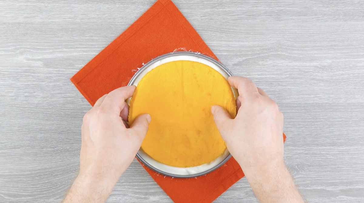 8. Entferne den Ring der Springform mit der gefrorenen Gelee-Masse, hebe diese mithilfe zweier Holzspieße vom Kuchenboden hoch und platziere auf die Frischkäsemousse in der anderen Kuchenform.