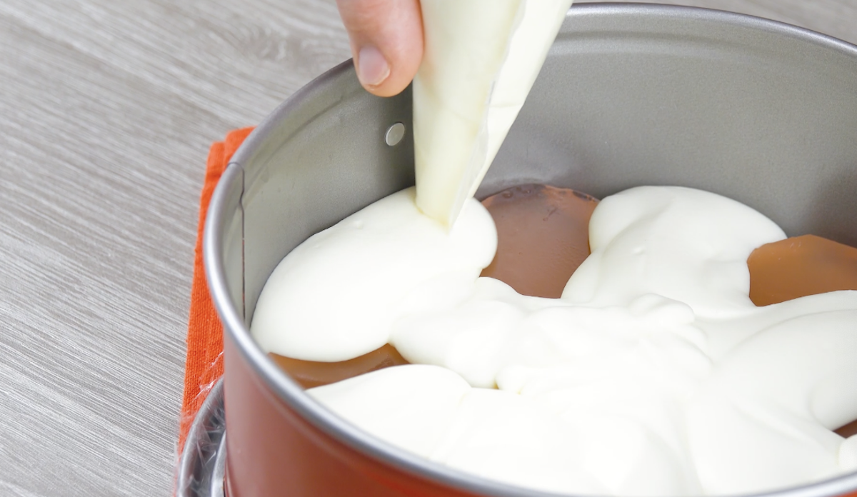 9. Verteile die restliche Frischkäsemousse in der Kuchenform und lege den ausgestochenen Biskuitkreis obendrauf. Stelle die Form dann für mindestens 4 Stunden kalt.