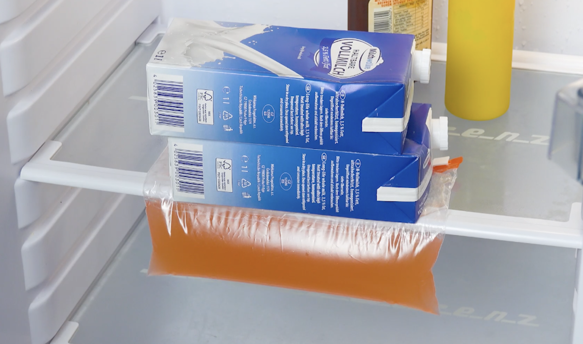 1. Erwärme den Grapefruitsaft mit Zucker in einem Topf. Weiche die Gelatine in kaltem Wasser ein und gib sie dann zu dem warmen Grapefruitsaft hinzu. Verrühre alles so lange, bis die Gelatine sich aufgelöst hat. Fülle den Saft in einen Zip-Beutel und hänge diesen für 2 Stunden in den Kühlschrank (so wie auf dem Bild zu sehen).