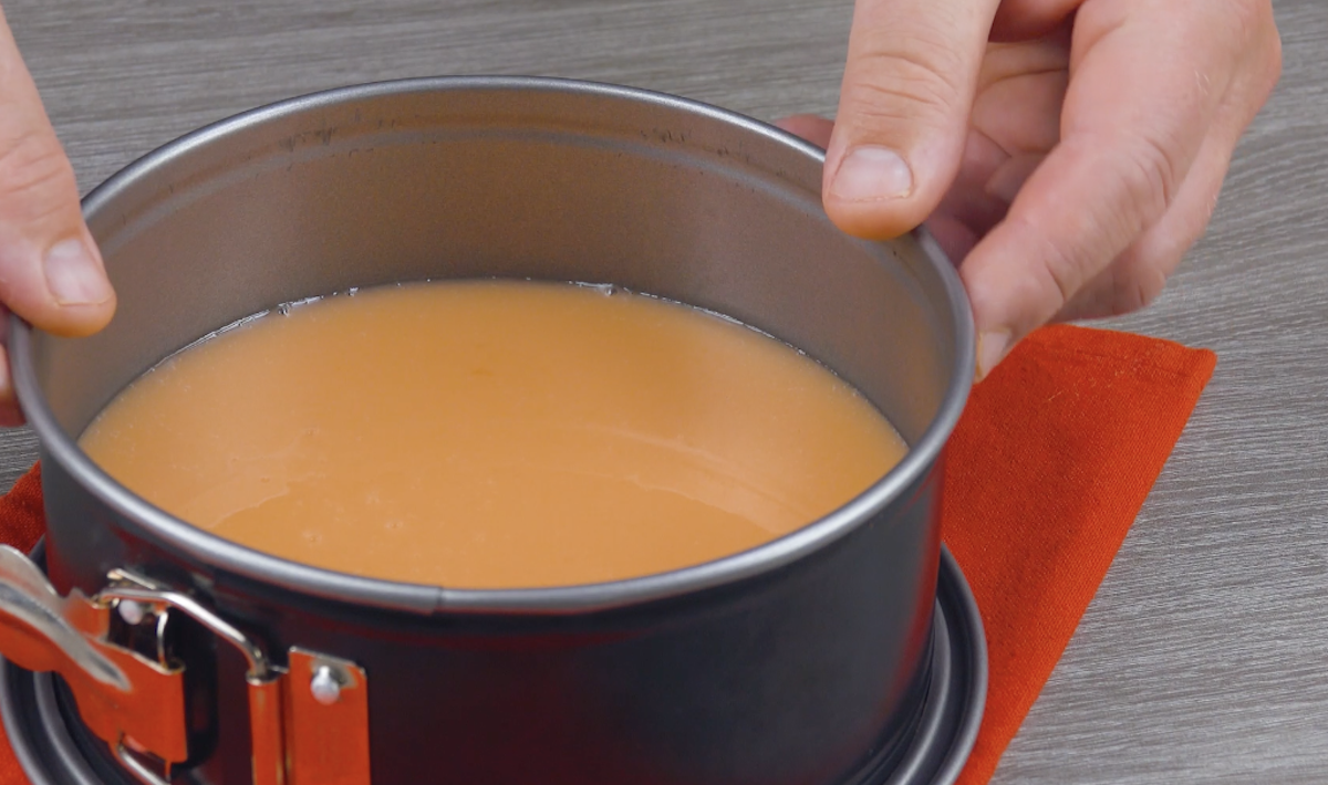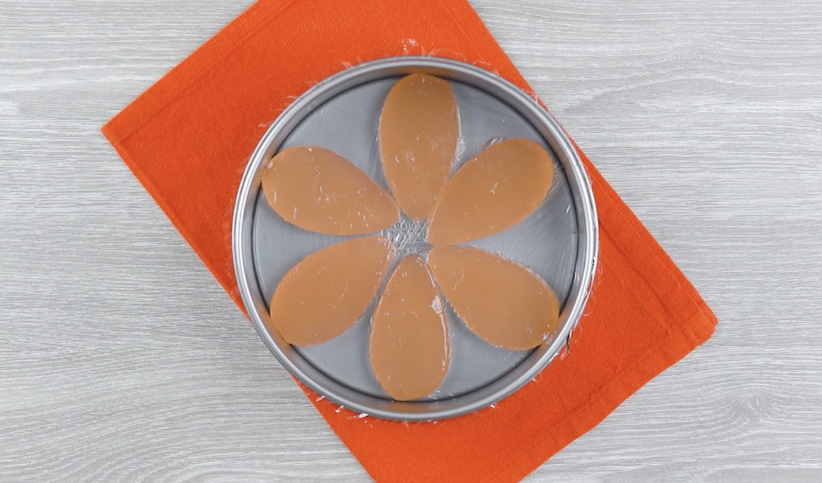 2. Wenn das Gelee fest ist, entferne den Zip-Beutel und schneide das Gelee in 6 tropfenförmige Scheiben. Lege Klarsichtfolie über den Boden einer Springform und spanne den Ring ein. Verteile die Gelee-Tropfen blütenförmig auf dem Boden.