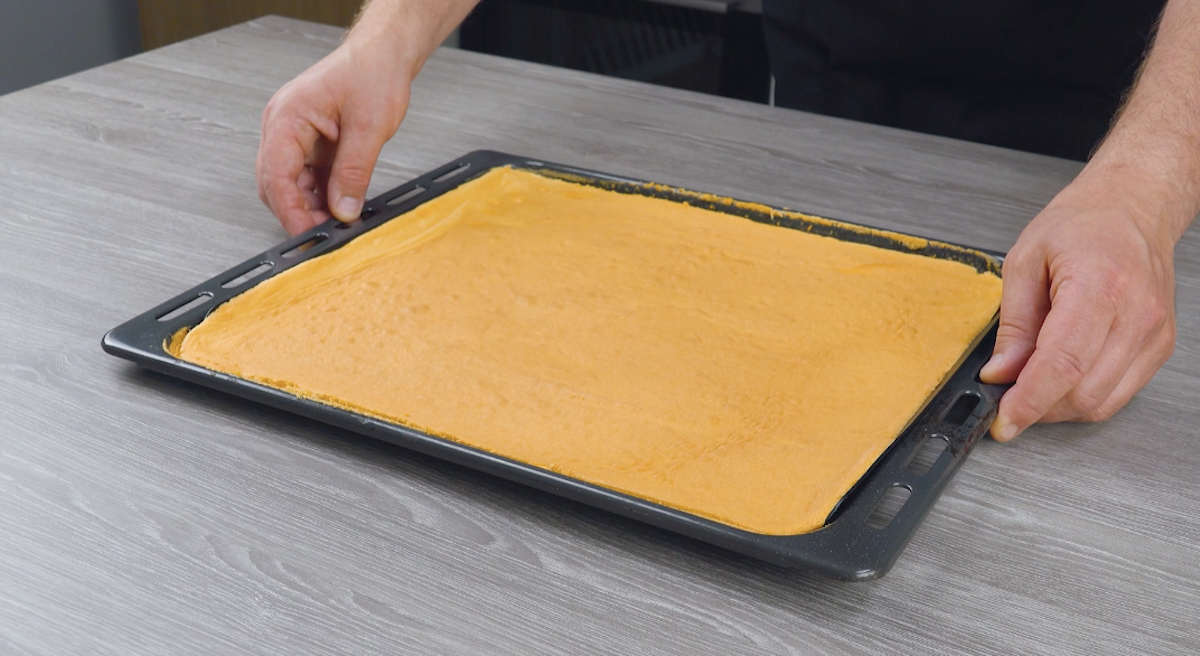 5. Widmen wir uns nun dem Biskuitteig. Trenne die Eier und verrühre die Eigelbe mit Zucker, Milch und Pflanzenöl. Gib gesiebtes Mehl hinzu. Schlage Eiweiß in der Küchenmaschine an und gib dann nach und nach Zucker hinzu. Wenn das Eiweiß halbfest ist, gibst du noch die Lebensmittelfarbe dazu. Hebe das gefärbte Eiweiß der Ei-Mehl-Mischung unter. Fette ein Backblech ein und lege darauf eine Silikonmatte. Verteile auf ihr den Biskuitteig, backe ihn für 15 bis 17 Minuten bei 165 °C Ober- und Unterhitze und lass ihn dann auskühlen.