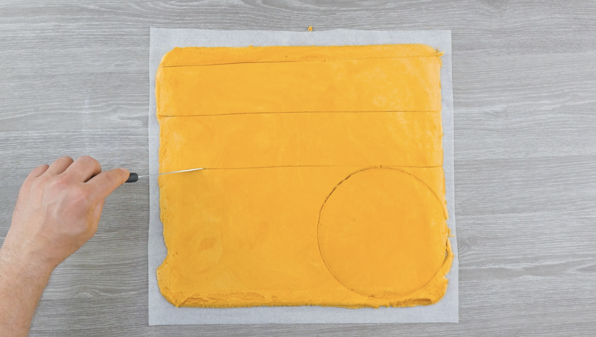 6. Ziehe die Silikonmatte vom Blech und decke sie mit Backpapier ab. Drehe den Teig um und entferne die Silikonmatte vorsichtig. Stich mit einem Metallring oder einer Schüssel einen Kreis mit 18 cm (oder kleiner Durchmesser) aus. Den Rest des Teiges schneidest du in ca. 7,5 cm breite Streifen.