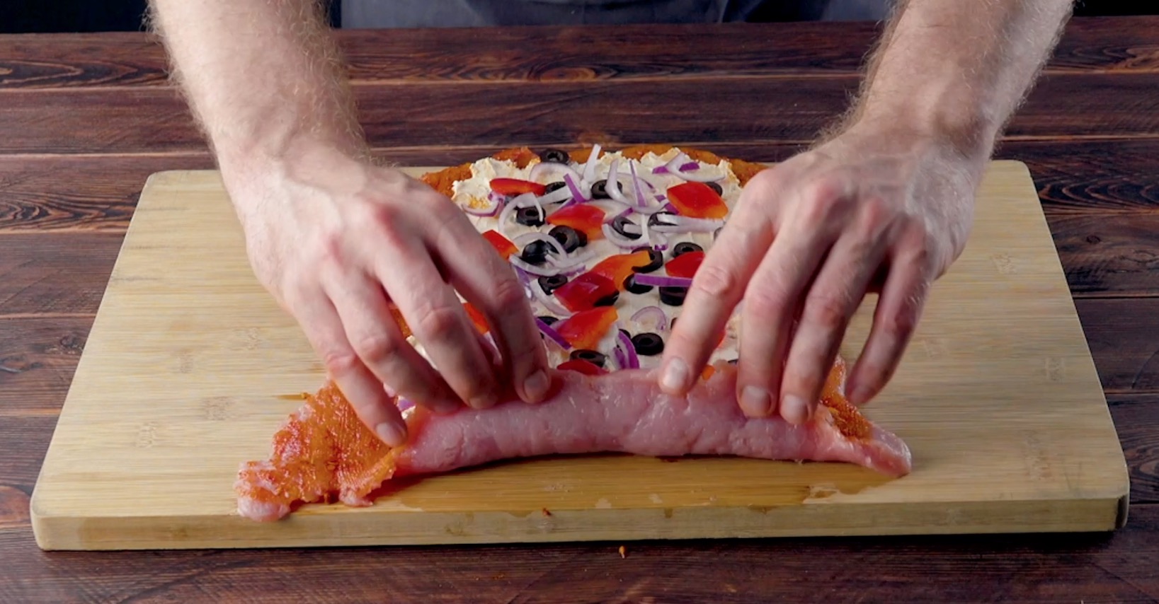 Nun wird das Gericht zum Schichtbraten: Lege dafür eine weitere Fleischplatte auf die erste und klappe die Ränder, die über die erste hinausstehen, nach unten.