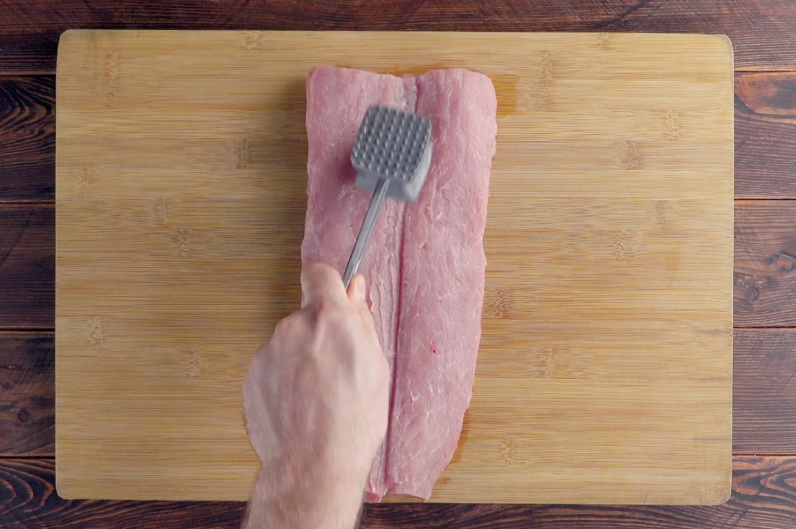 1.) Halbiere das erste Stück Schweinerücken zunächst längs. Lege dann eine Hälfte beiseite und schneide die andere mittig der Länge nach ein. Dieser Einschnitt sollte etwa halb so tief gehen, wie das Fleisch dick ist. Klappe den Schweinerücken dann auseinander und plattiere ihn mit einem Fleischklopfer.