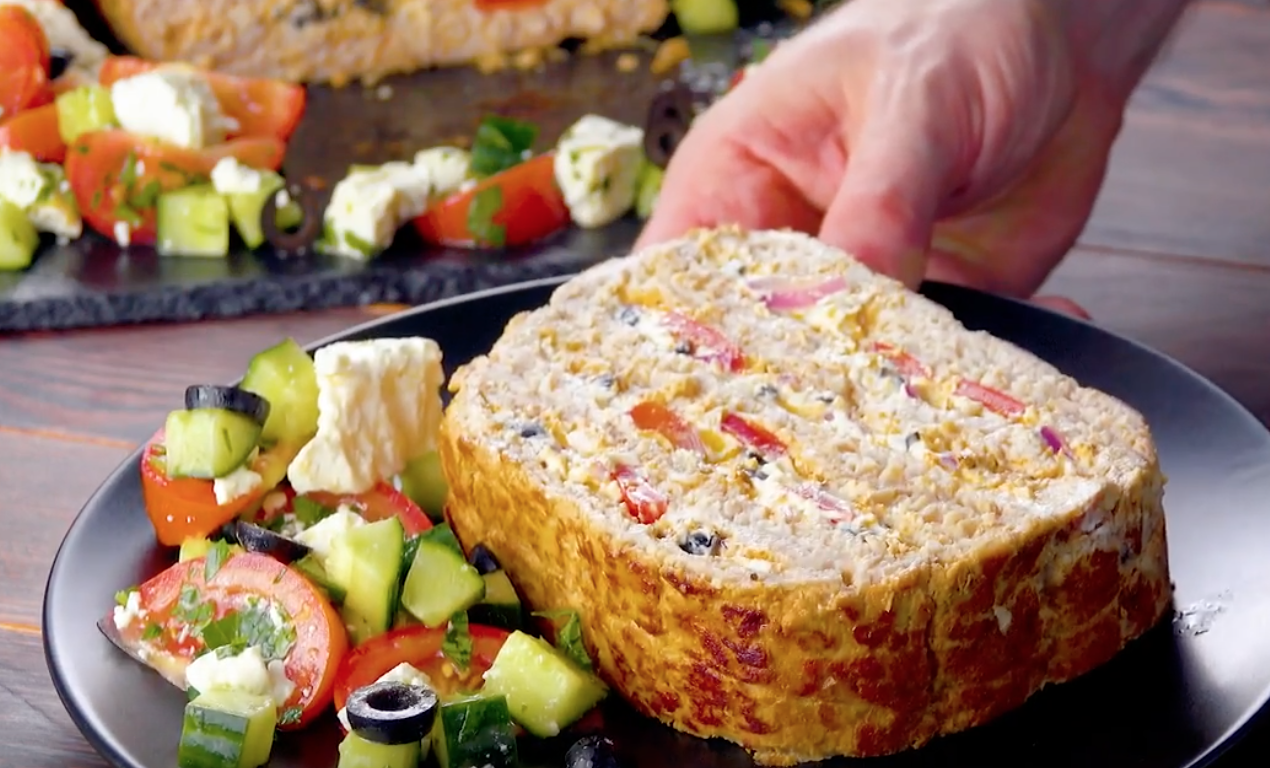 Tipp als Beilage und zum Garnieren: Drapiere vor dem Servieren einen griechischen Salat aus Fetakäse, Olivenscheiben, Tomaten- und Gurkenstückchen um den Gyros herum.