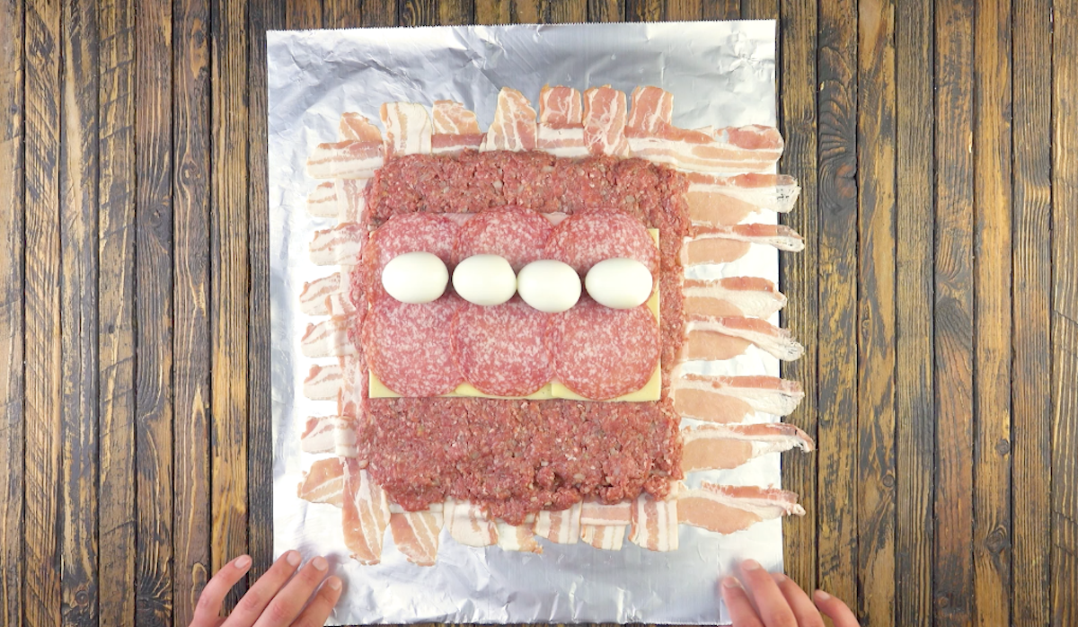 2.) Dann nimmst du ein großes Stück Alufolie und flichtst die Speckscheiben darauf zu einem Gitter. Auf 3 Seiten der Folie solltest du dabei einen großzügigen Rand lassen. Die Hackfleischmasse wird als etwas kleineres Quadrat als der Speck auf diesem verteilt, sodass dieser auf allen Seiten etwas übersteht.
