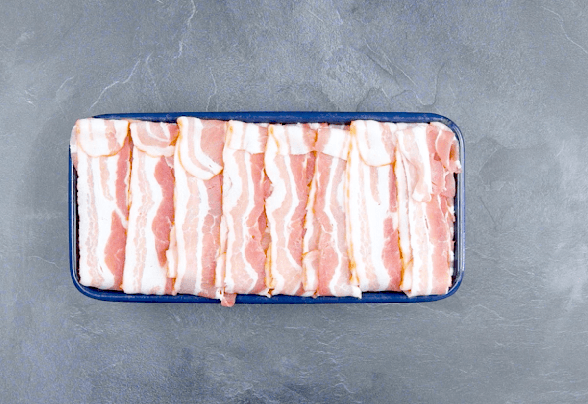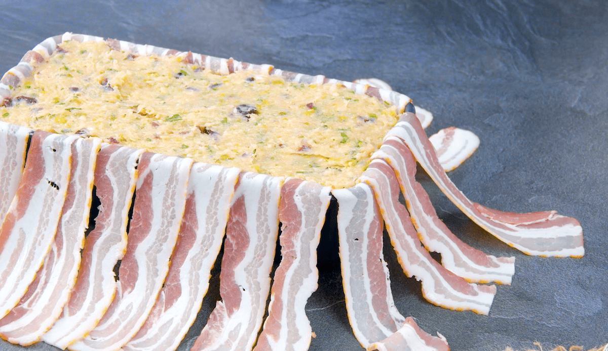4. Fette die kleine Kastenform ein und belege den Boden mit einander leicht überlappenden Speckstreifen. Lege Speckstreifen ebenfalls über die Ränder und lass sie vorerst aus der Form heraushängen.