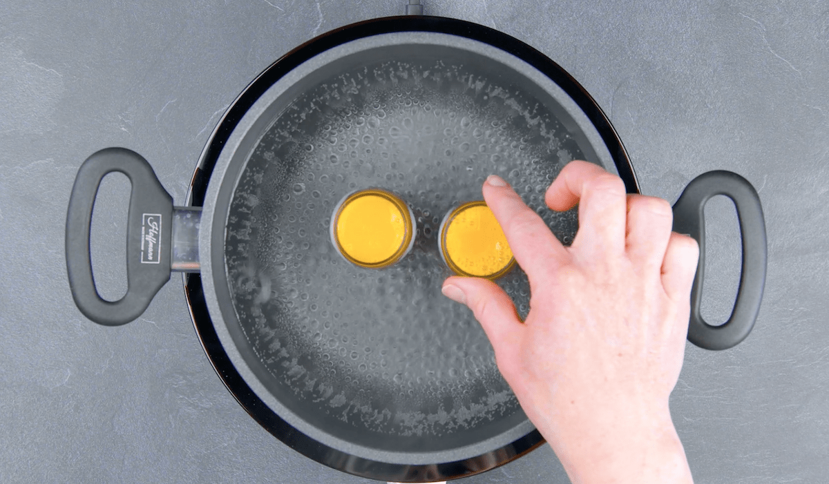 1. Trenne für das lange Ei zunächst die 4 Eigelbe und die 4 Eiweiße voneinander. Gieße die Eigelbe dann in zwei hohe, schmale Gläser und stelle sie für etwa 5 Minuten in kochendes Wasser, bis sie geronnen sind.