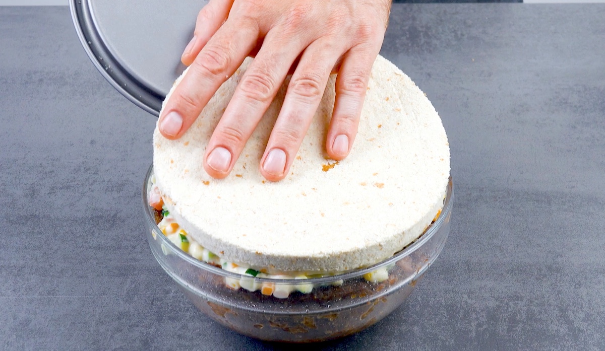5. Teile die Gemüsemischung nun auf die drei Hackfleischschalen auf und stelle diese ineinander.
