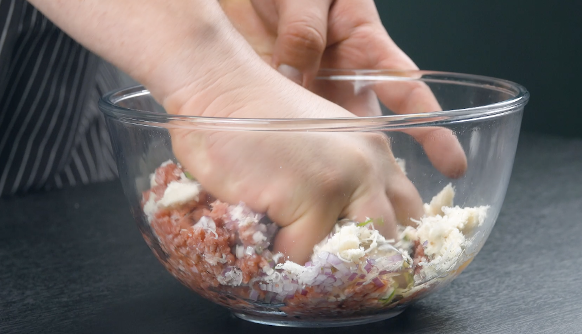 1. Gib Hackfleisch, klein geschnittene Zwiebel, Petersilie, Ei, Salz, Pfeffer und geriebenen Parmesan in eine Schüssel. Rupfe dann noch die Scheibe Toast hinzu und vermenge alles miteinander.