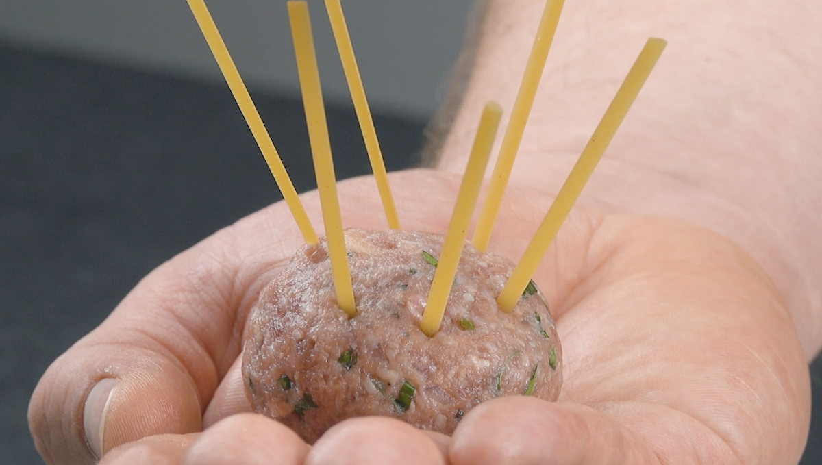 3. Brich die Nudeln in 3 gleich große Teile. Stecke 8 bis 10 gleich große Nudeln in eine Seite der Hackbällchen. Stelle die Bällchen erst einmal beiseite.