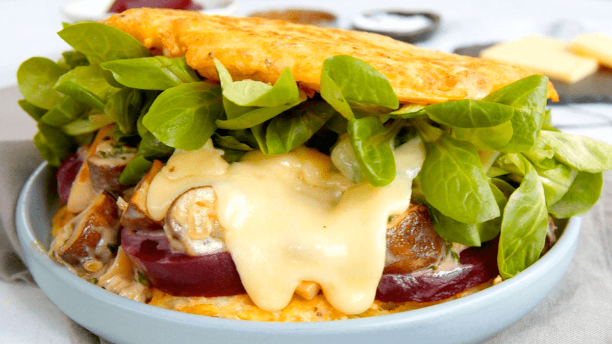 Ja, ganz richtig gelesen, aus Kartoffelrösti kann man wunderbar einen Burger kreieren. Dazu vermischt man geriebene Kartoffeln mit fein gehackter Hähnchenbrust. Dann formt man aus der Masse zwei große Rösti und brät sie in einer Pfanne von beiden Seiten an. Daraufhin belegen wir die Rösti mit Rote Bete-Scheiben, knackigem Feldsalat und einem würzigen Pilzragout. Dazu gibt’s noch frischen Feldsalat und eine cremige Käsesauce.
