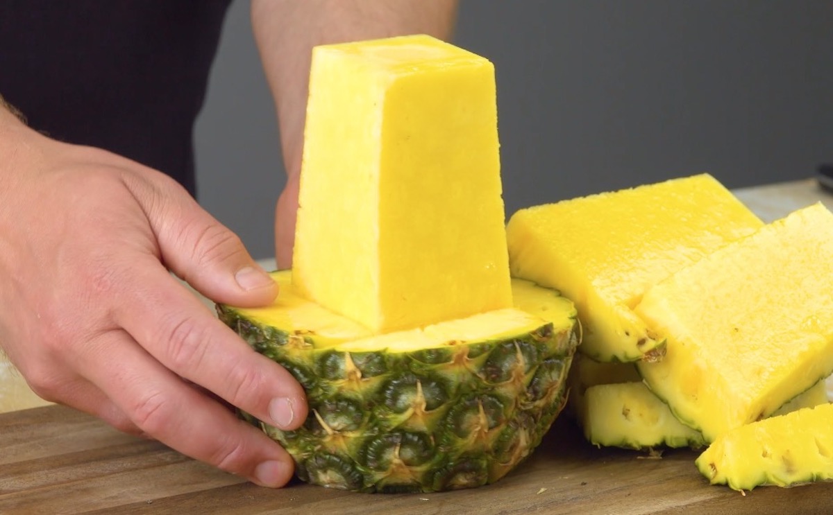 2.) Schneide die Ananas so zurecht, dass ein kleines „Podest“ entsteht. Hebe den Deckel und die restlichen Ananas-Stücke unbedingt auf.