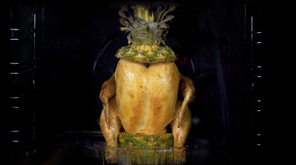 4.) Platziere nun den Ananasdeckel auf dem Hähnchen und befestige ihn mit einem Holzstäbchen. Schiebe das Hähnchen dann für 15 Minuten in den vorgeheizten Ofen. Dann bepinselst du es erneut mit der Marinade, reduzierst die Ofentemperatur auf 190 °C und lässt es noch mal 45 Minuten garen.