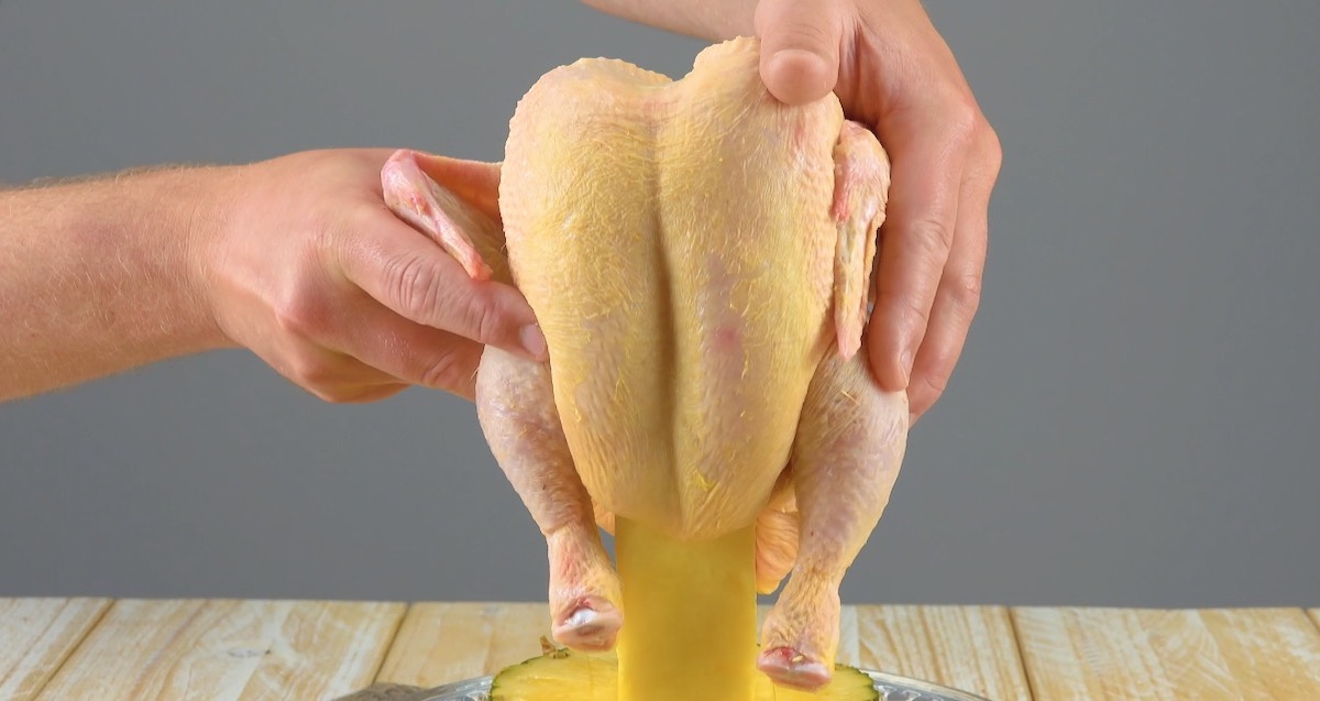 3.) Stelle das Ananas-Podest in eine Auflaufform, stülpe das Hähnchen darüber und bestreiche es mit der zuvor zubereiteten Marinade.