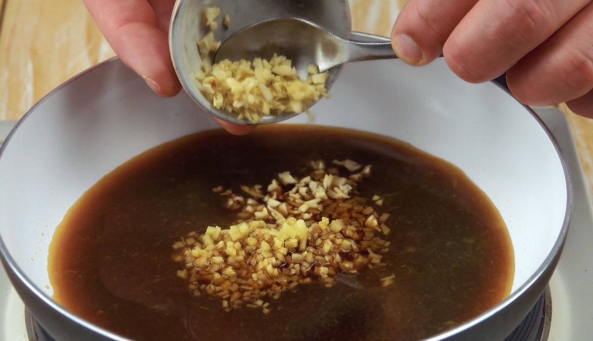 1.) Fange am besten mit der Marinade an. Dazu erhitzt du in einem Topf die Sojasauce mit Zucker, Ananassaft, dem gehackten Knoblauch und Ingwer. Lasse alles bei reduzierter Hitze 5 Minuten lang köcheln, bis die Marinade eine dickflüssige Konsistenz angenommen hat. Zum Abkühlen stellst du die Marinade kurz beiseite. Heize den Ofen schon einmal auf 220 °C Umluft vor.